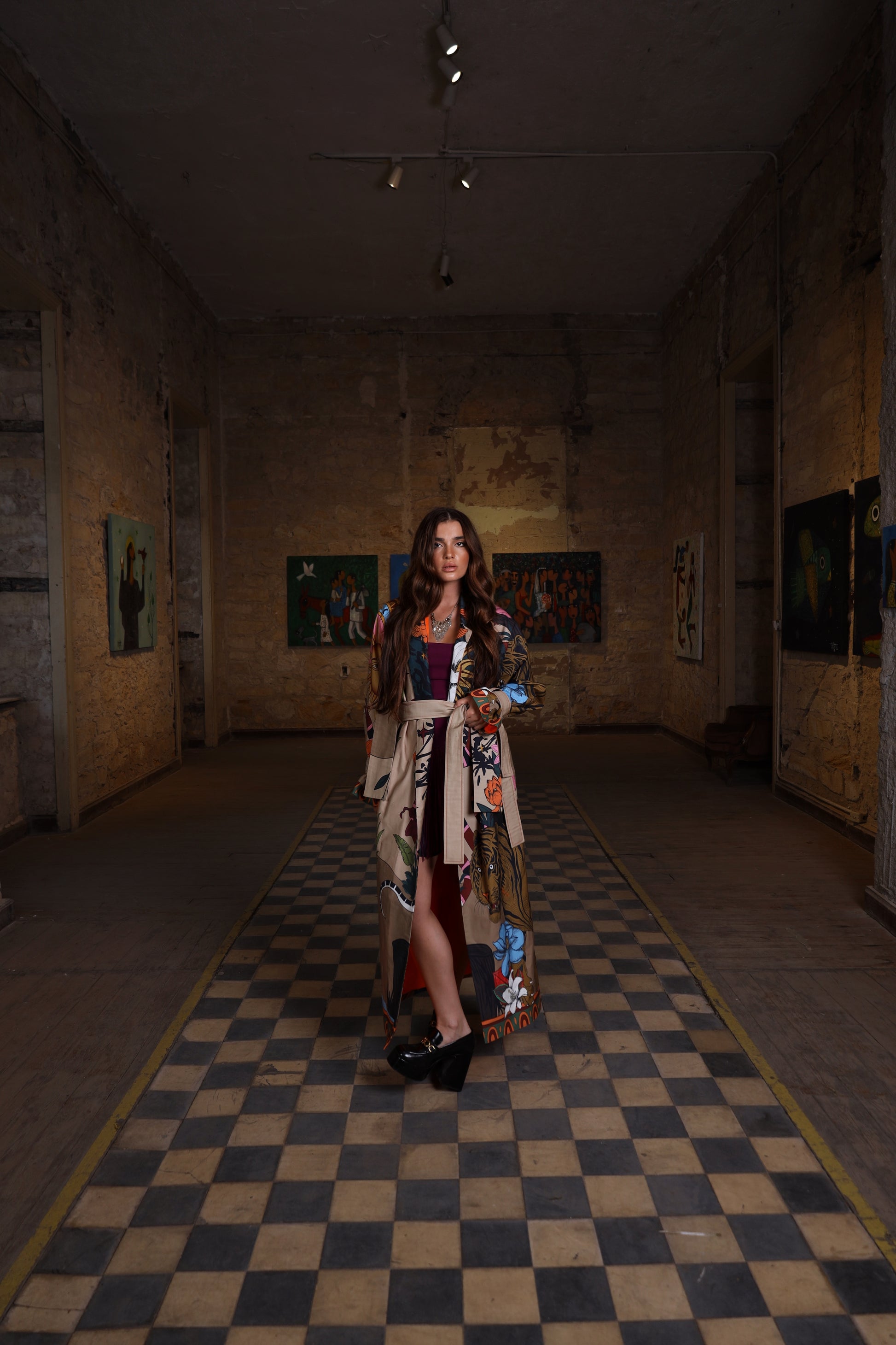 A masterpiece crafted from 100% natural gabardine, this trench coat channels the deep, stabilizing energy of Earth through rich symbolic artwork and refined tailoring. The silhouette is elegant and fluid, featuring classic lapels, adjustable cuffs, and a draped structure that moves with grace. A statement piece that blends ancient heritage with modern luxury — perfect for collectors, art lovers, and those connected to Earth’s grounding energy.