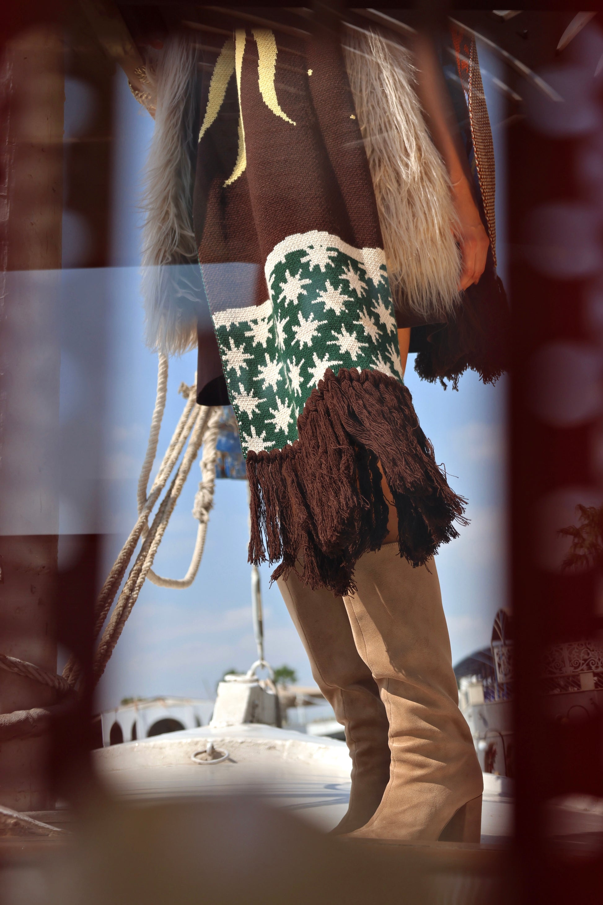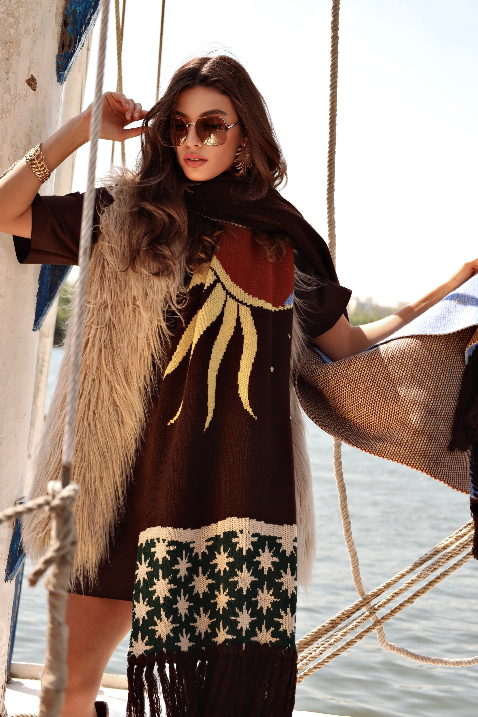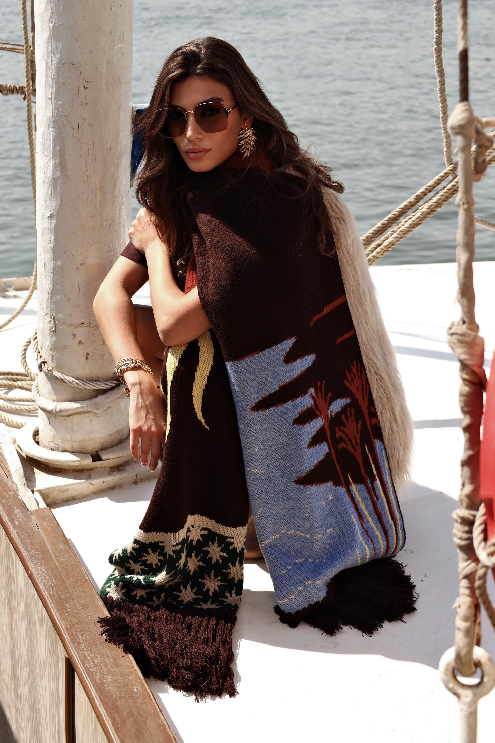 When night falls upon the Nile, the moon becomes its mirror. Lunar Reflections captures that sacred stillness — when the river glows with silver light and the world seems to exhale. Inspired by the harmony between water and sky, this design celebrates the quiet strength of femininity and the cycles of renewal that flow through nature and soul alike. Each woven thread echoes the moon’s journey across the water — a dance of light and shadow, of endings and new beginnings. The deep browns evoke the fertile earth along the riverbanks, while shades of blue and gold recall moonlit ripples and the first kiss of dawn.