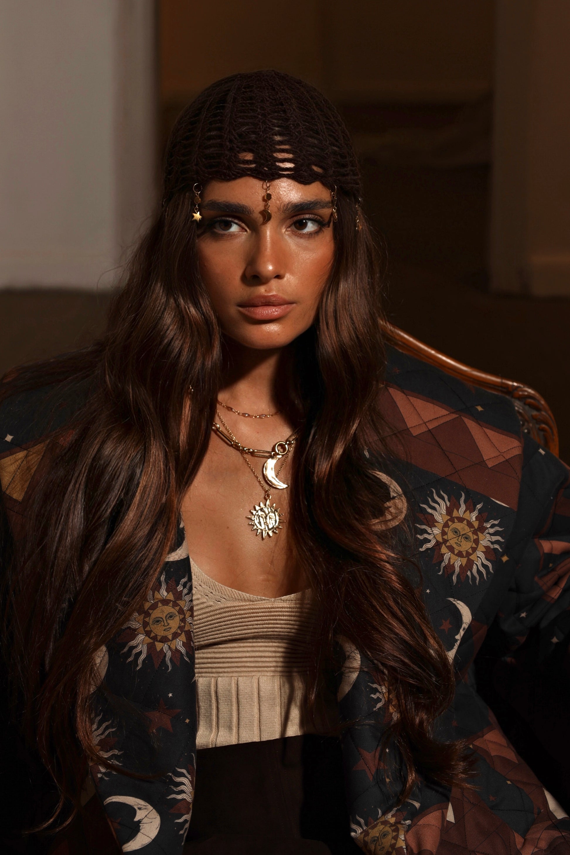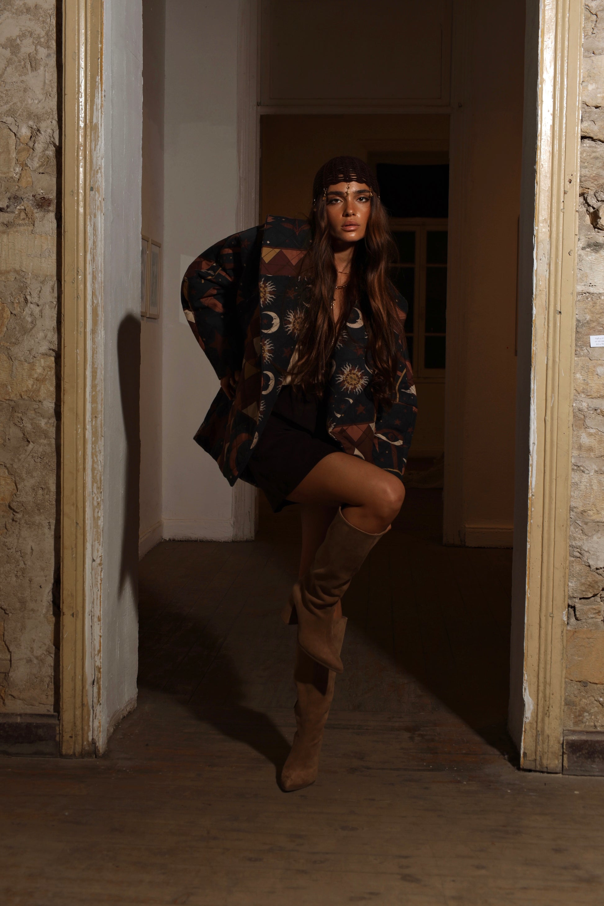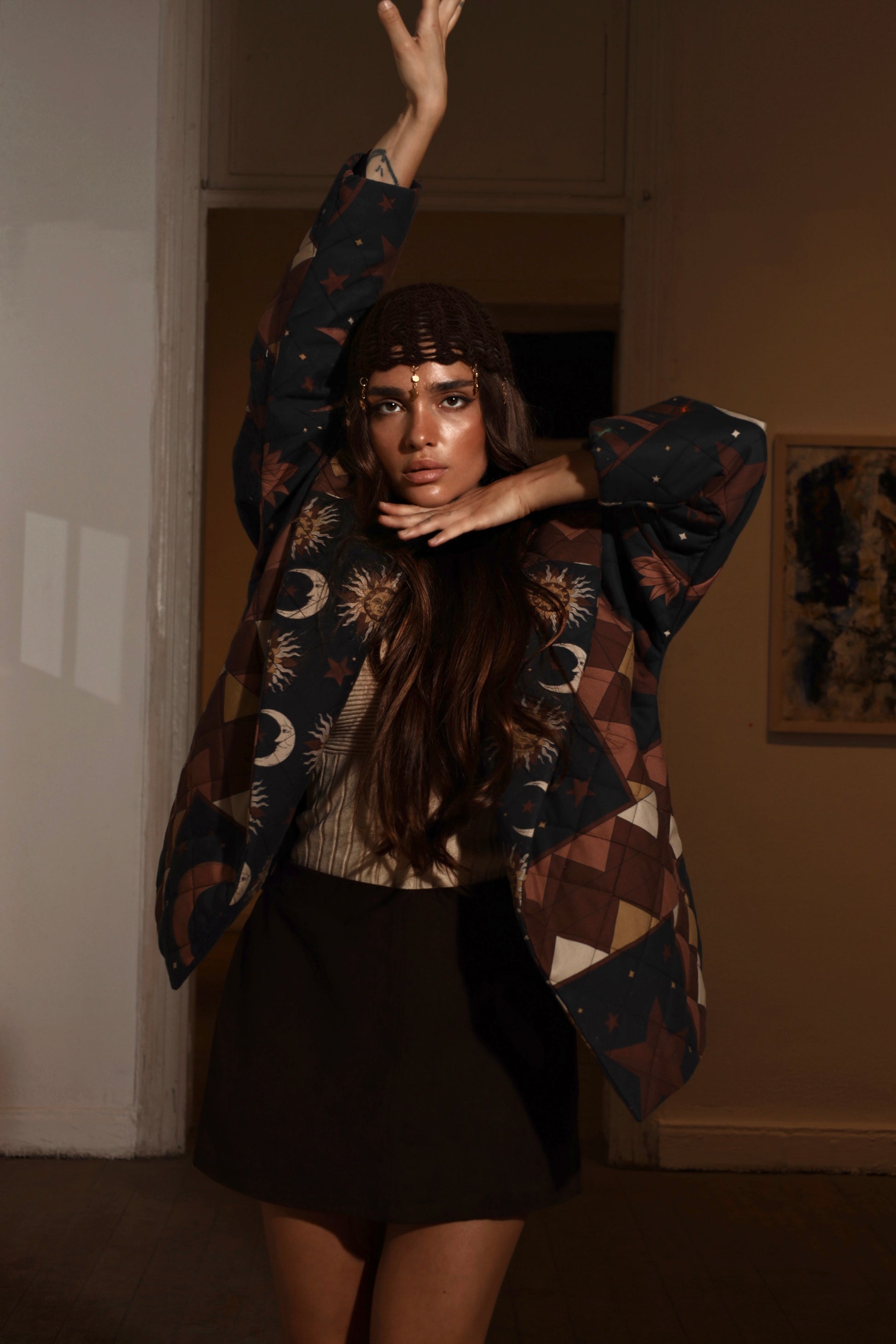 Crafted from 100% natural gabardine and richly quilted for warmth, this coat embodies the bold, glowing spirit of the Sun Element. Its artwork features radiant sun faces, crescent moons, and patterned star constellations — merging night and day into a harmonious celestial tapestry. The silhouette is structured yet soft, offering comfort and elegance. The quilted texture adds depth to the sun-inspired print, making it a standout piece for cooler seasons. Designed for those who carry confidence, warmth, and light wherever they go.