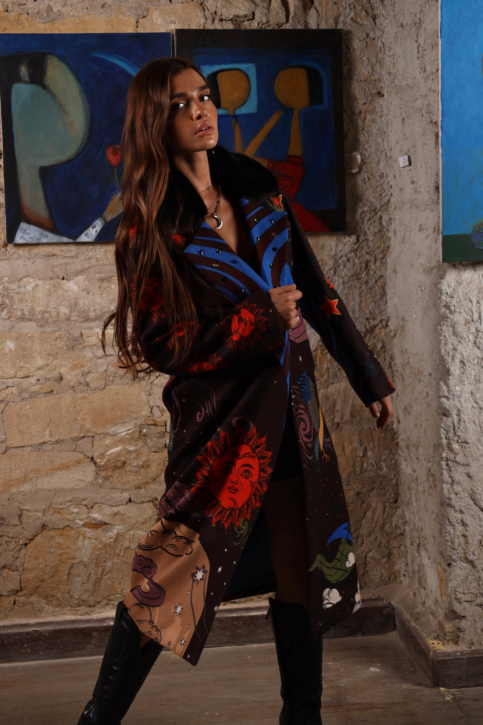 Crafted from luxurious wool-baze, this Air Element coat blends warmth with fluid motion. The artwork evokes drifting breezes, cosmic symbols, and sweeping sky patterns — creating a sense of movement even when the wearer is still. A detachable faux-fur collar (secured with hidden buttons) allows versatile styling, transitioning the coat from dramatic winter elegance to clean, airy structure. The silhouette is tailored yet soft, giving a refined shape that floats with the body — a perfect harmony between warmth and lightness. A modern interpretation of ancient sky symbolism, designed for those who carry freedom, clarity, and vision in their spirit.